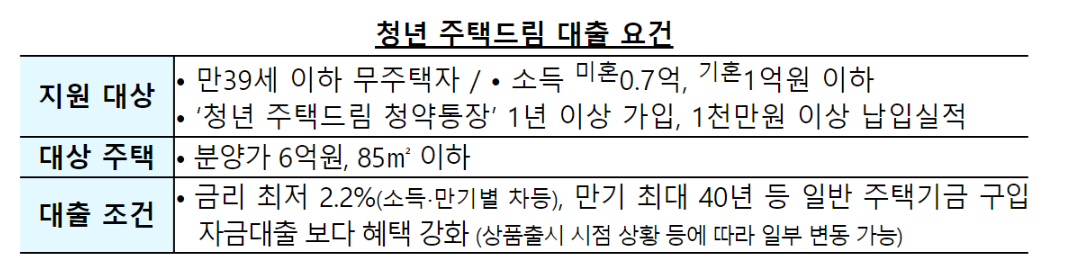 국토교통부는 청년들의 주택 구입을 돕기 위해 최대 4.5%의 이자를 제공하는 청년 주택드림 청약통장과, 연 2%의 저금리 주택담보 대출 상품을 발표하였습니다. 청년 주택드림 청약통장 가입자만