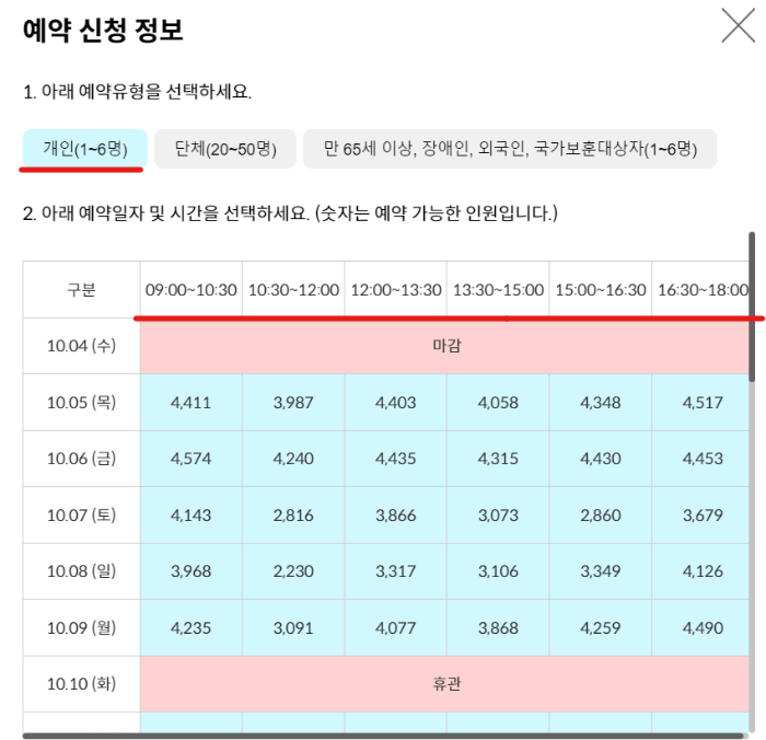 ④ 저는 아래와 같이 10월 5일 개인으로 오전 시간에 신청해 보았습니다.