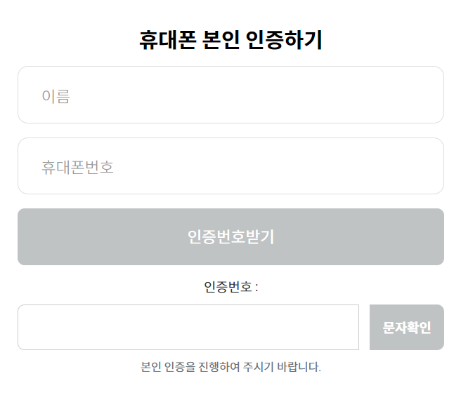 인증 번호 6자리를 입력한 후 문자 확인 눌러주시면 본인인증란 빈칸에 이름과 전화번호가 입력되어 있습니다.