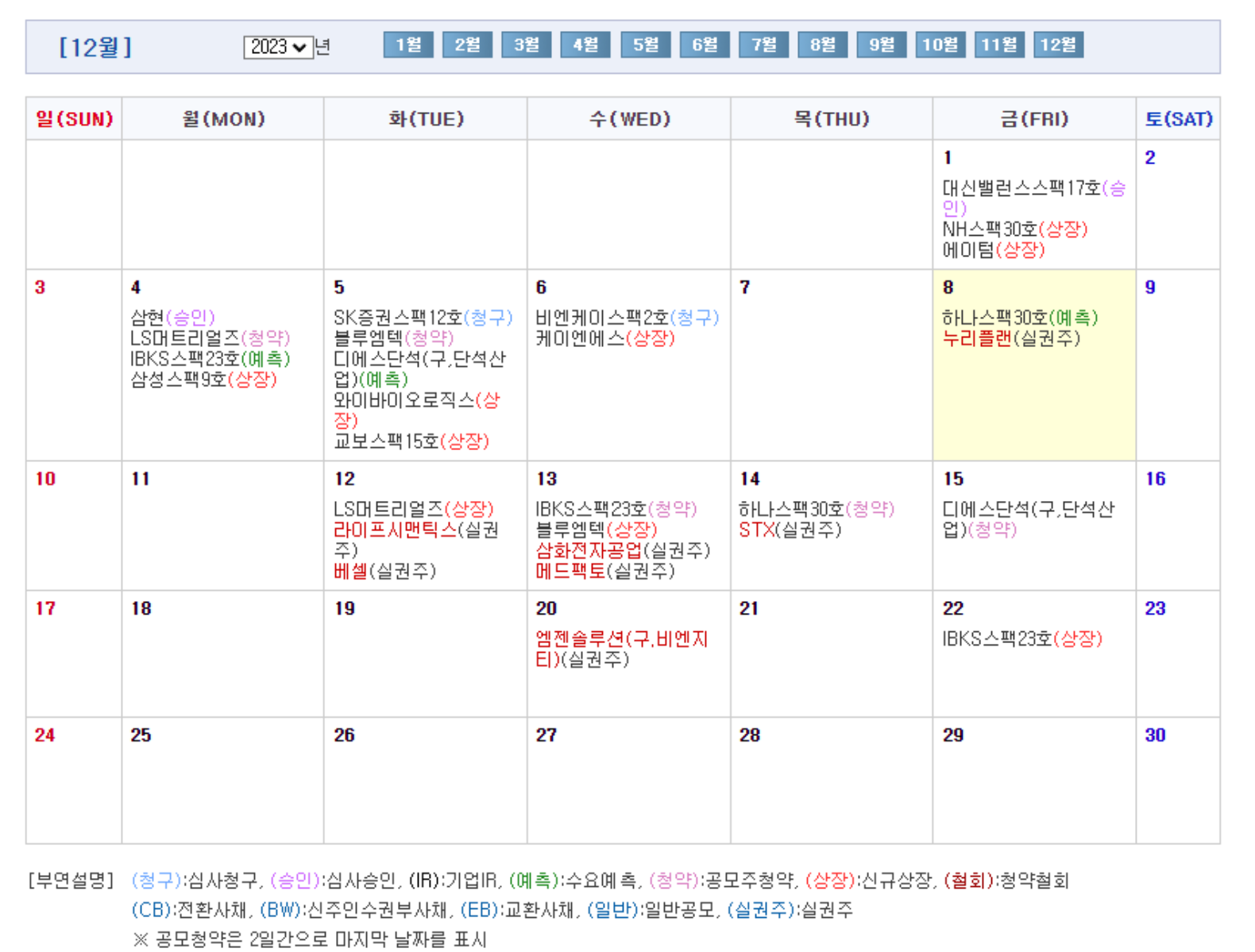12월의 마지막 공모주는 디에스단석 한 곳이 남았고 청약이 진행되고 있습니다. 디에스단석의 공모가와 상장일, 수요예측 등의 상세 정보는 아래의 글에서 참조하실 수 있습니다. 그리고 주의하셔야 할 점은, 12월이 IPO의 마감 시기라는 것입니다. 12월 3주 차부터는 공모주 청약이 없기 때문에, 매년 마지막을 장식하는 이 시기까지 꼭 공모주 청약을 완료하셔서 올해를 원활하게 마무리하시기 바랍니다.
