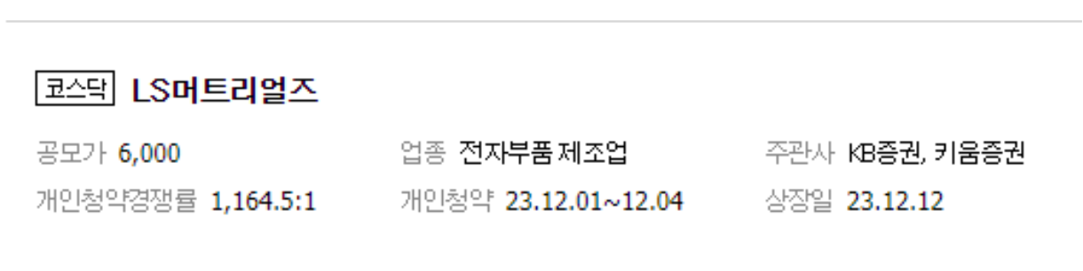해당 기업의 상장일은 12월 12일이며, 공모가는 6,000원으로 확정되었습니다. 이번에 공모되는 주식의 총수량은 14,625,000주입니다. 청약 일정은 12월 1일부터 4일까지였고, 주간사로는 키움증권, KB증권, 이베스트투자증권, 하이투자증권, NH투자증권이 참여했습니다.