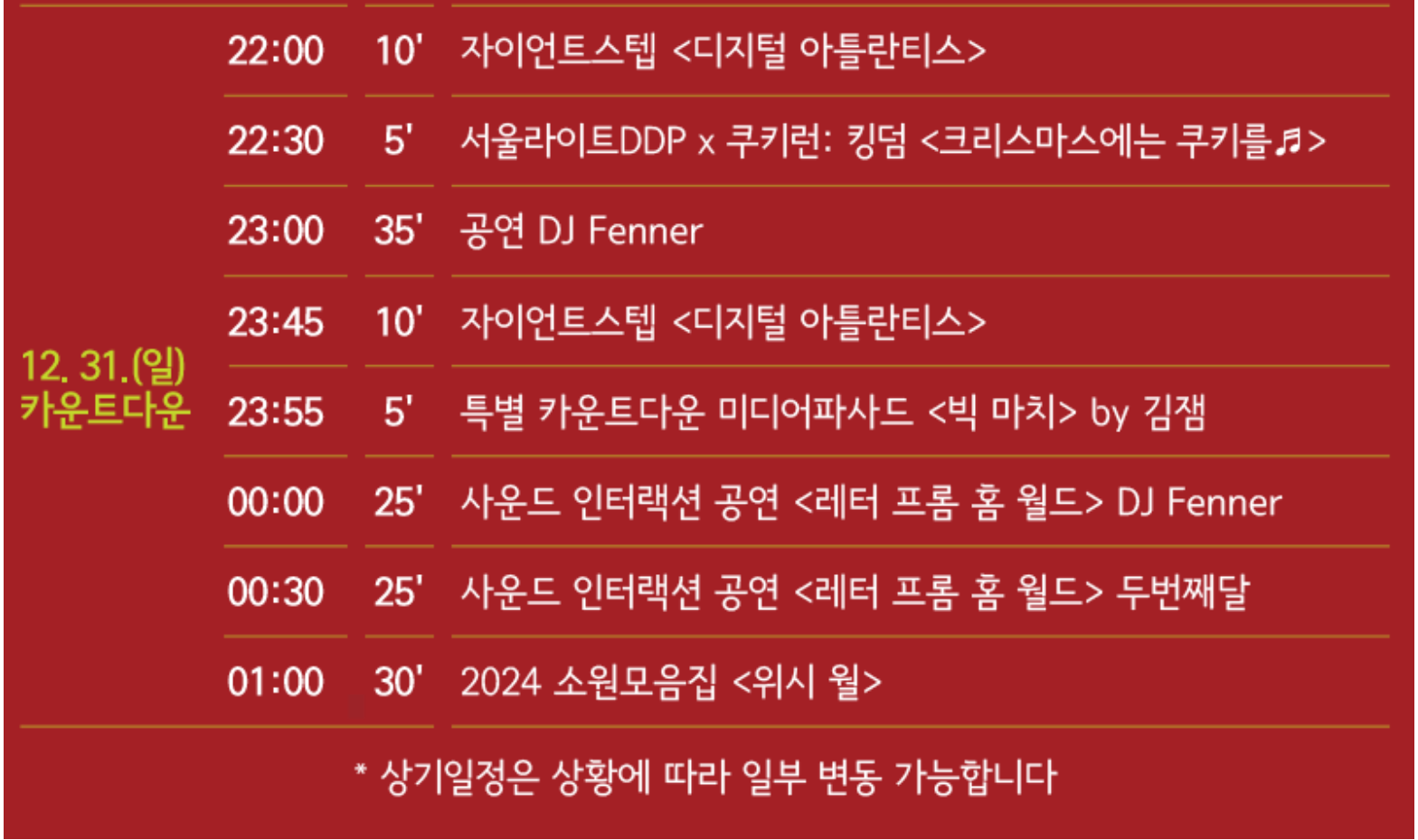 - 일정 : 2023. 12. 31. (일) 23시 ~ 2024. 01. 01. (월) 1시 30분