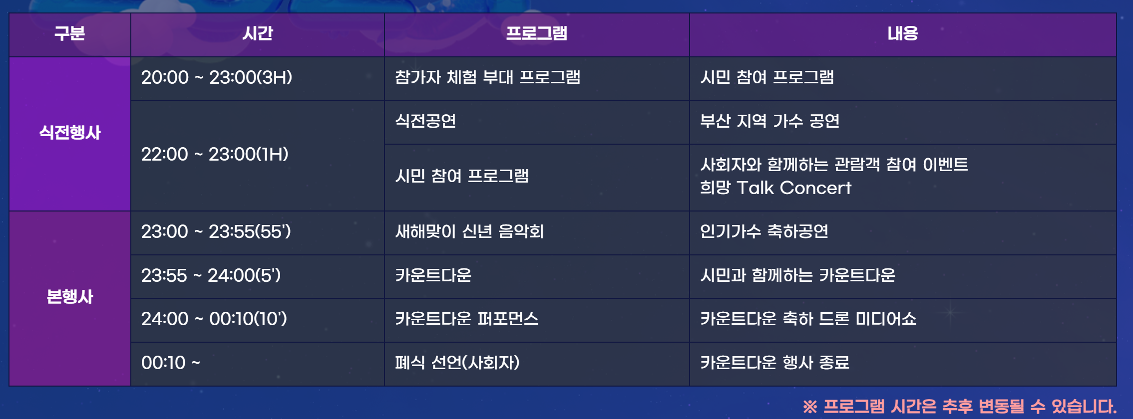 23년 12월 31일 ~ 24년 1월 1일 부산광안리해수욕장에서 2024 COUNTDOWN BUSAN 행사가 개최됩니다. 행사일정과 프로그램에 대해 자세히 알아보겠습니다. 2024 부산 해맞이축제 바로가기 부산 해맞이 축제 2