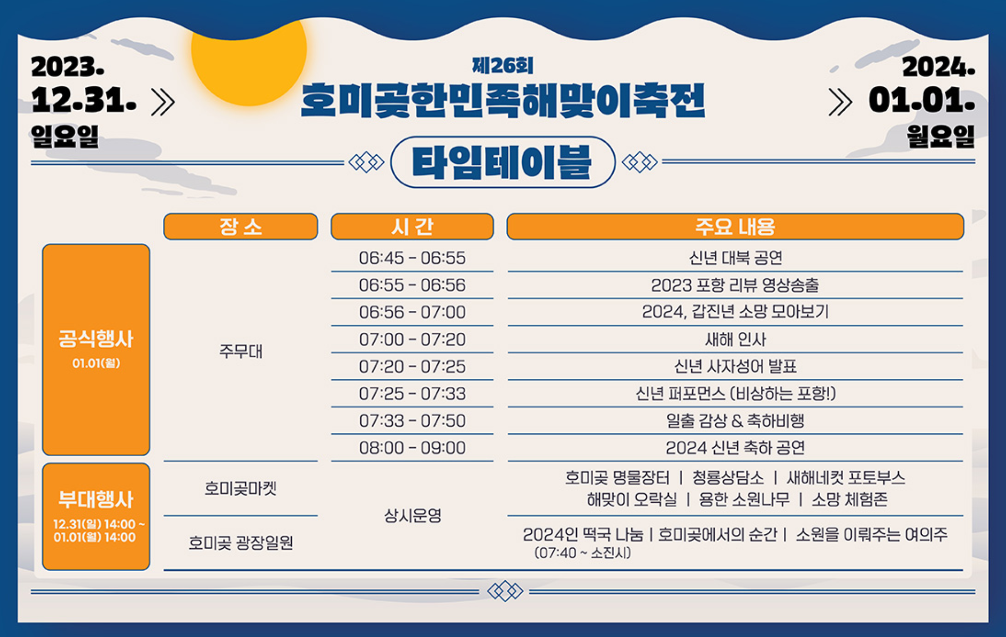 - 부대 프로그램 : 호미곶 마켓(판매 부스), 떡국 나눔, 포토 부스, 플로깅 체험, 현장 참여 이벤트 등